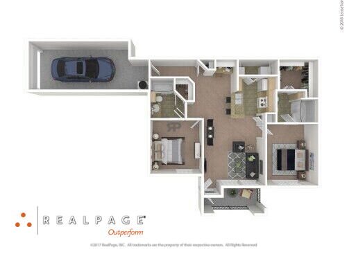 Apartments feature nine-foot ceilings, crown molding, ceiling fans, private garages, and fully-equipped kitchens.